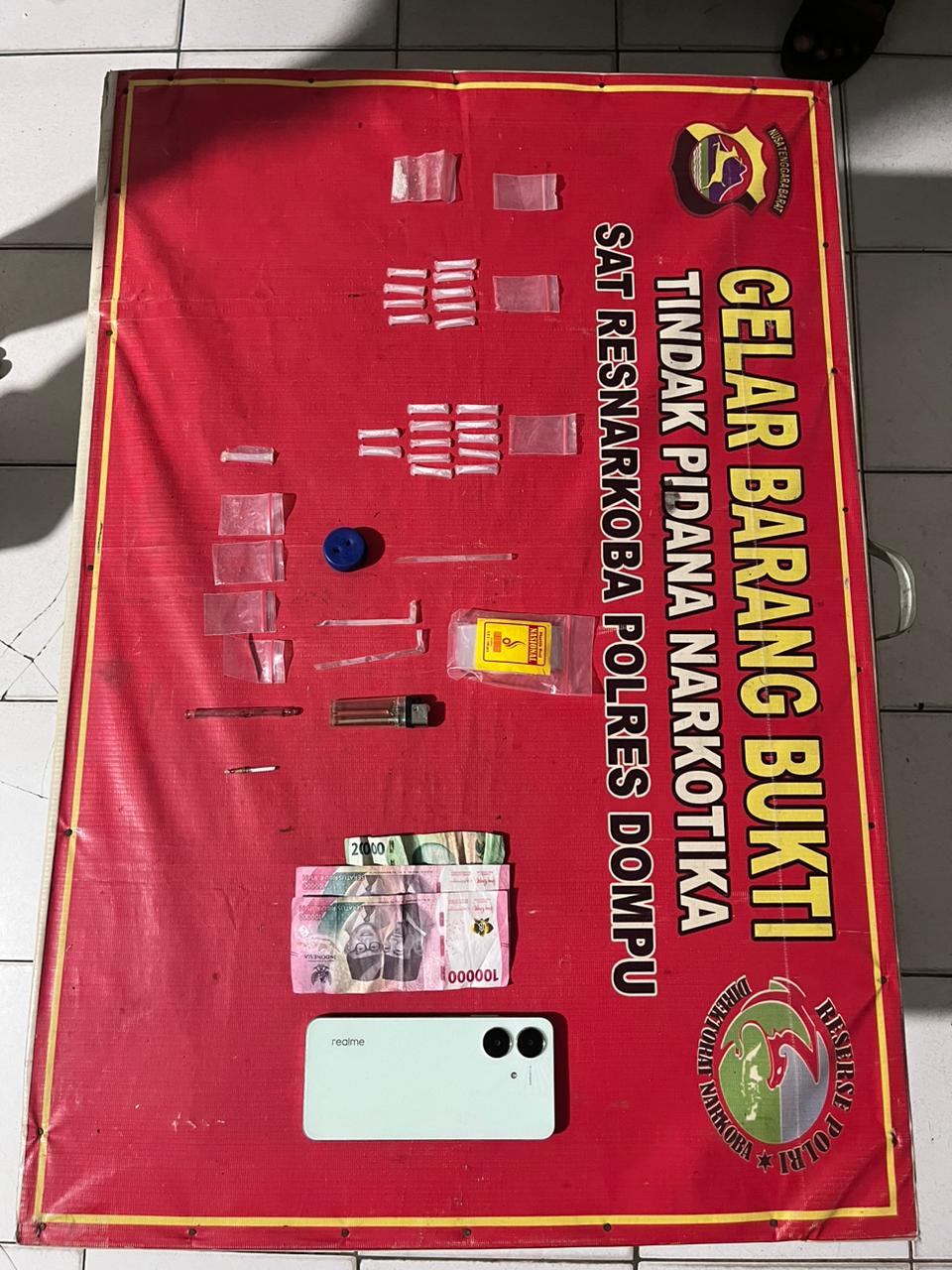 Terduga F sebagai pengedar narkotika jenis sabu-sabu di wilayah Dusun ngaro na,e Desa Tanju Kecamatan Manggelewa Kabupaten Dompu.