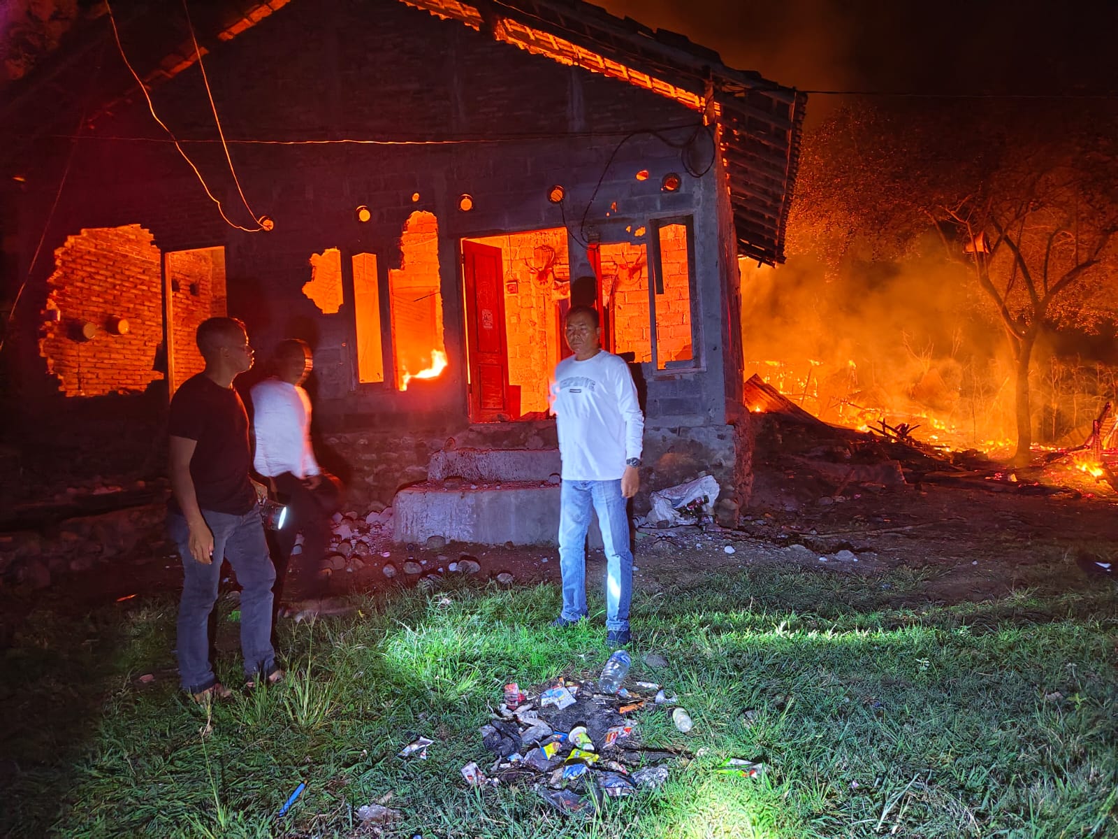 Namun, karena pelaku tidak ditemukan di lokasi, massa kemudian melakukan perusakan hingga membakar rumah milik terduga pelaku.