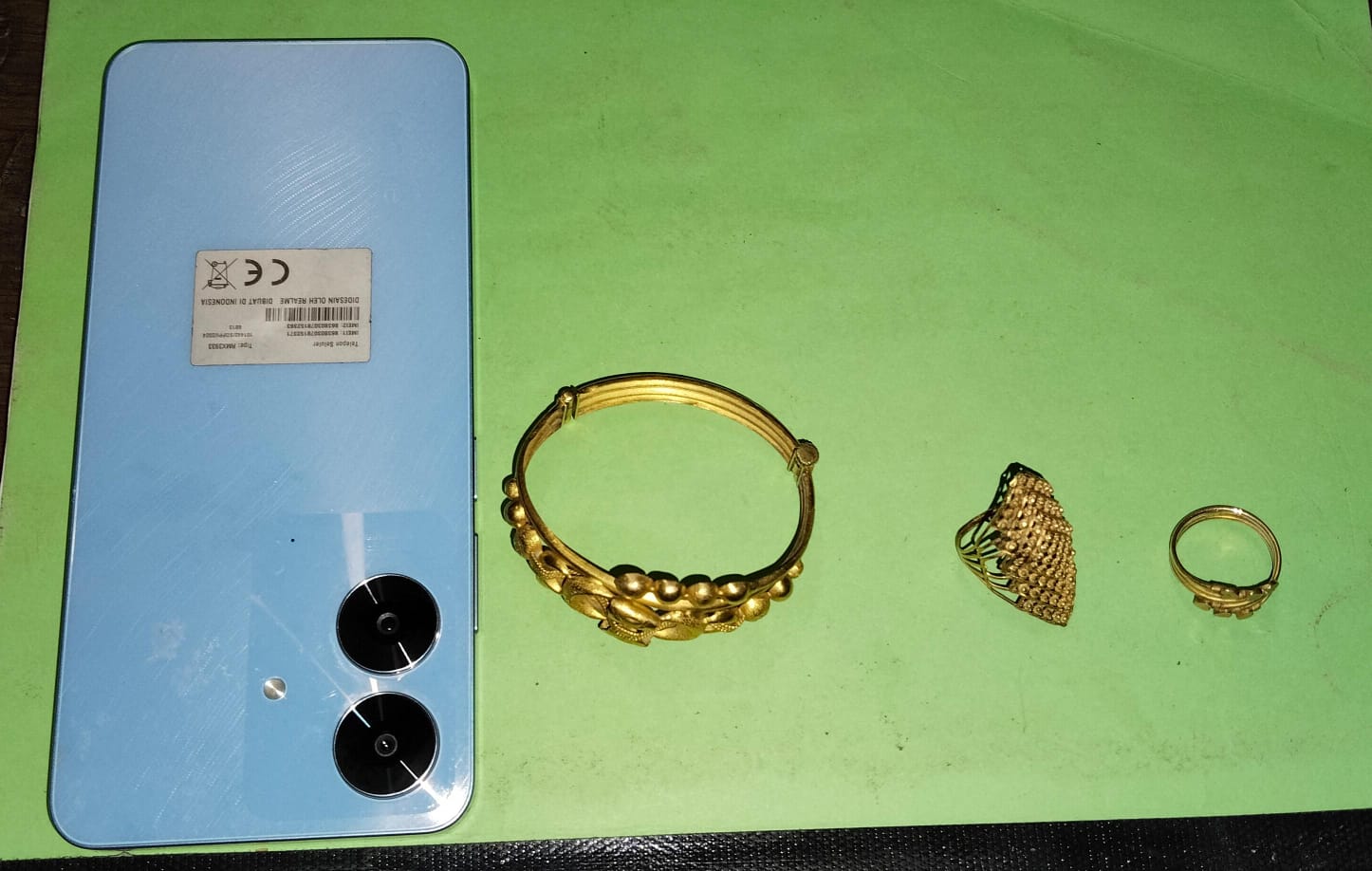 Barang bukti yang berhasil diamankan berupa satu gelang emas, dua cincin emas, serta satu unit handphone merek Realme Note 60 warna biru yang dibeli pelaku dari hasil kejahatan seharga Rp1.300.000.