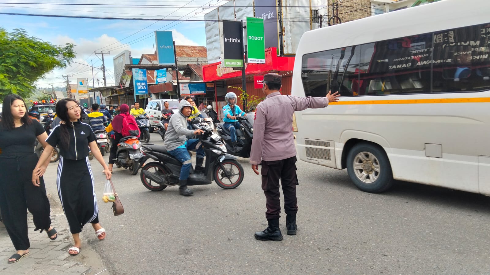 Personel terlihat melakukan pengaturan lalu lintas di ruas jalan utama Kecamatan Maluk yang dipadati kendaraan roda dua maupun roda empat, sekaligus membantu penyeberangan pejalan kaki dan pengendara untuk mengurai kemacetan dan mencegah kecelakaan lalu lintas.