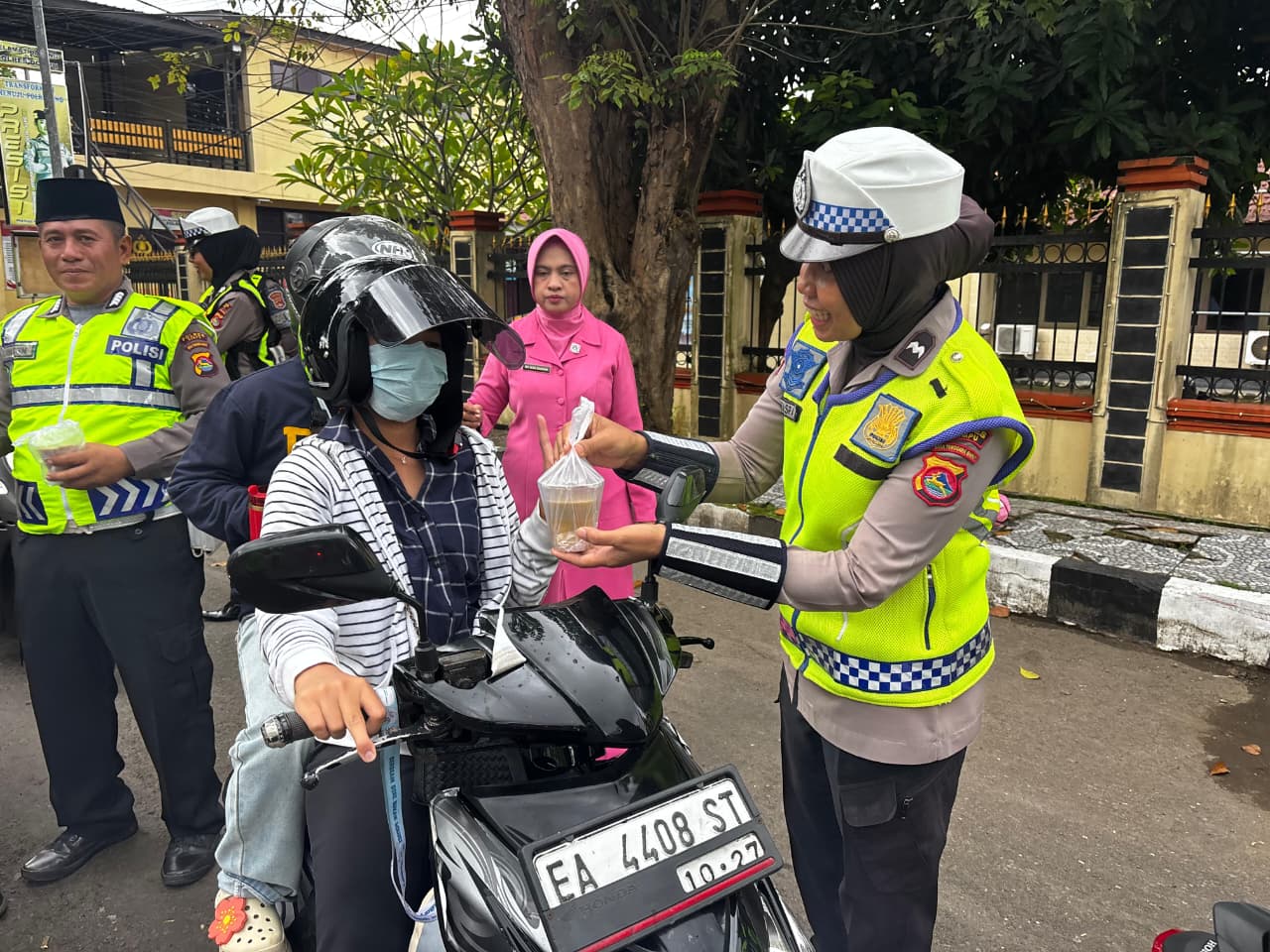 Selain membagikan takjil, personel Sat Lantas juga tetap melakukan pengaturan arus lalu lintas guna memastikan situasi tetap aman, tertib, dan lancar selama kegiatan berlangsung.