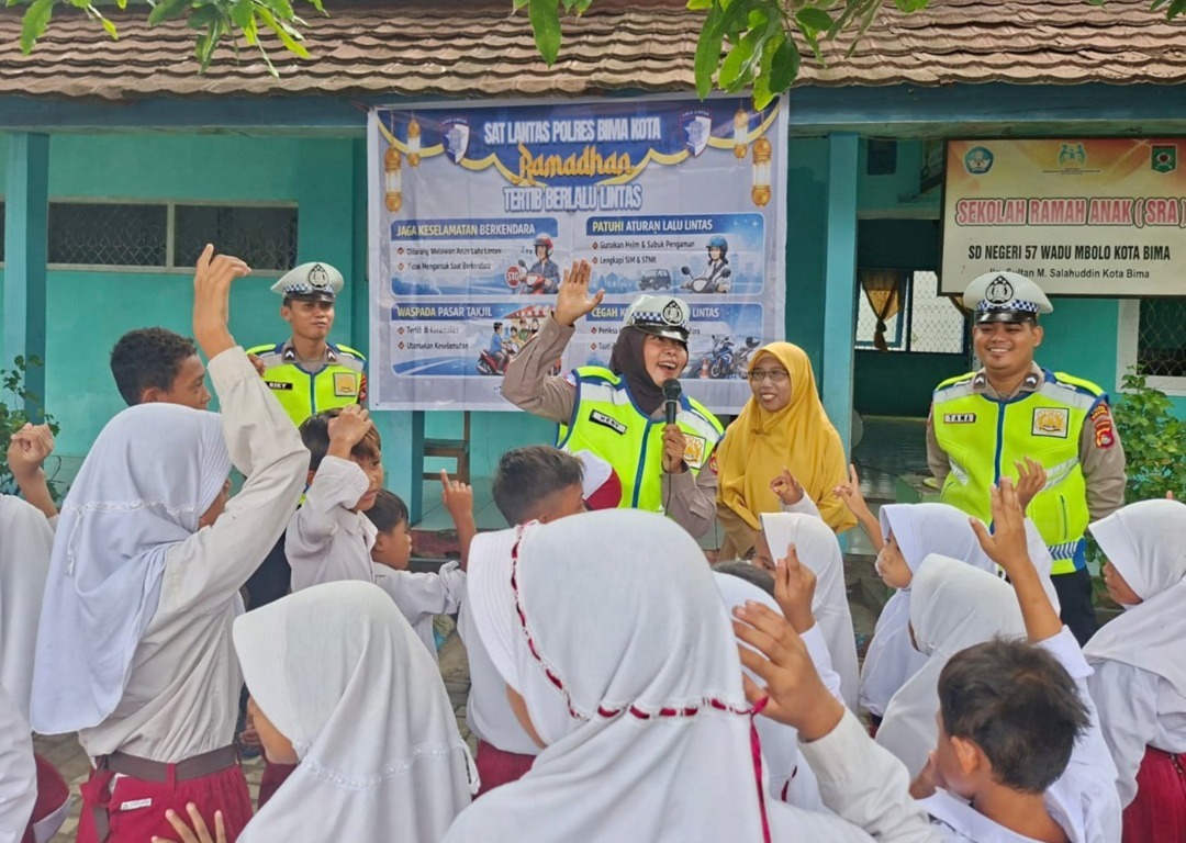 Kota Bima, NTB (3 Maret 2026) – Dalam rangka menanamkan kesadaran tertib berlalu lintas sejak usia dini, Satuan Lalu Lintas Polres Bima Kota melaksanakan kegiatan sosialisasi bertajuk “Ramadhan Tertib Berlalu Lintas” di SDN 57 Wadumbolo Kota Bima, pada Senin (2/3/2026) pukul 08.30 WITA.