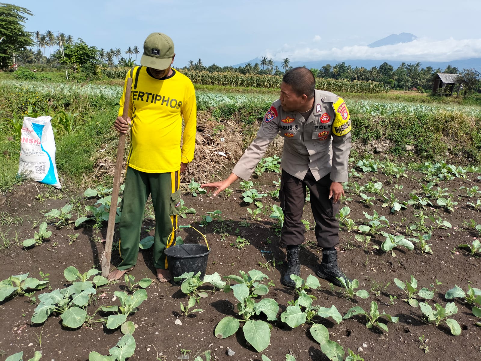 Dalam kegiatan tersebut, Bripka Agus Salim menyambangi keluarga Bapak Husni sebagai sasaran utama. Selain menjalin silaturahmi, ia juga melakukan pengecekan langsung terhadap tanaman sayur berupa bunga kol yang berada di lahan persawahan milik warga.