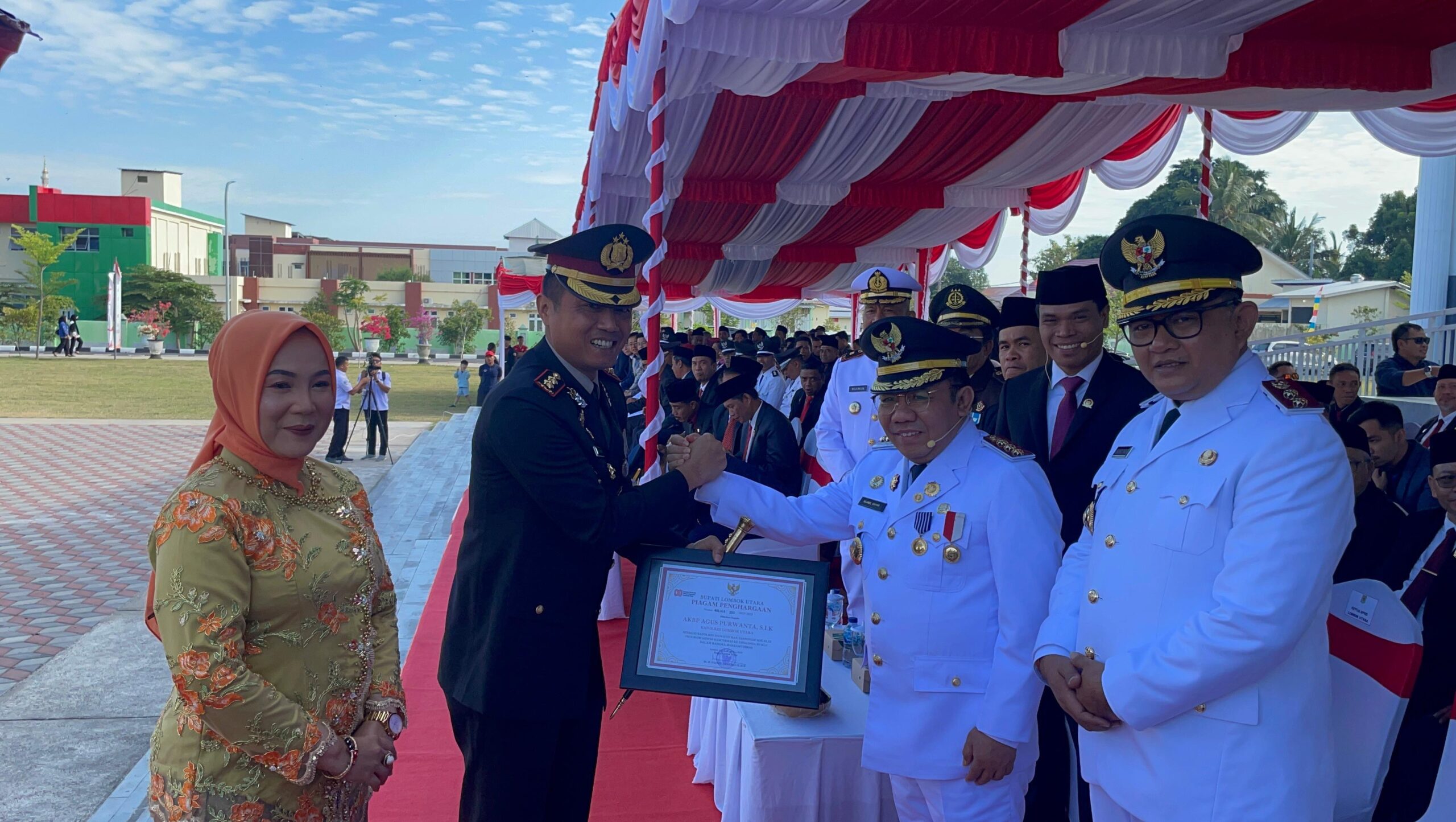 Dalam momen tersebut, Kapolres Lombok Utara AKBP Agus Purwanta, S.I.K., bersama Ketua Bhayangkari Cabang Lombok Utara Ny. Heny Agus Purwanta menerima piagam penghargaan dari Bupati Lombok Utara.