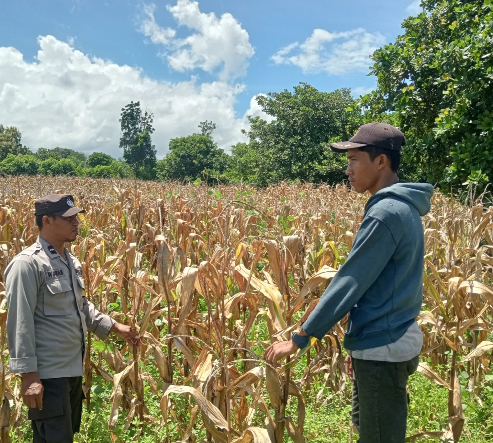 Pemantauan dilakukan oleh Bhabinkamtibmas Desa Nangakara, Aipda Wawan, terhadap lahan jagung milik Bapak Mardin (30), dengan luas sekitar 1 hektar. Tanaman jagung yang dibudidayakan merupakan varietas hibrida merk NK dan saat ini telah memasuki masa panen, yang dimulai sejak bulan Maret 2026, dengan estimasi hasil panen mencapai 7 hingga 8 ton.