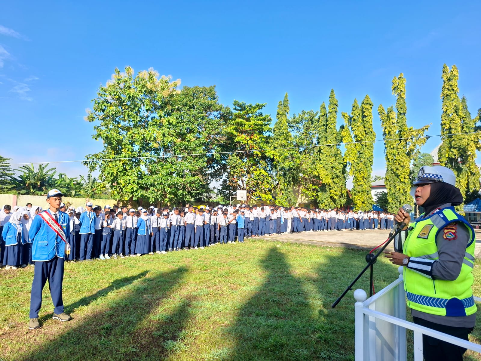 Personel Unit Kamsel Satlantas Polres Bima Kota Berikan Imbauan Keselamatan Berlalu Lintas di SMPN 1 Kota Bima