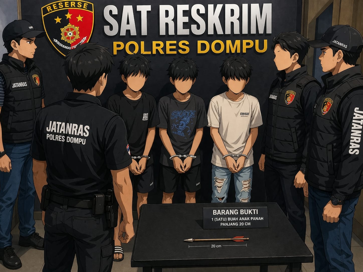 Tim Jatanras Satuan Reserse Kriminal (Sat Reskrim) Polres Dompu berhasil mengungkap kasus tindak pidana penganiayaan menggunakan busur panah yang terjadi di wilayah Kabupaten Dompu. Dalam waktu kurang dari 24 jam, petugas berhasil mengamankan tiga orang terduga pelaku di lokasi berbeda, yakni di Lingkungan Bali Bunga, Kelurahan Kandai 2, Kecamatan Woja dan Lingkungan Ujung Pandang, Kelurahan Bali, Kecamatan Dompu.