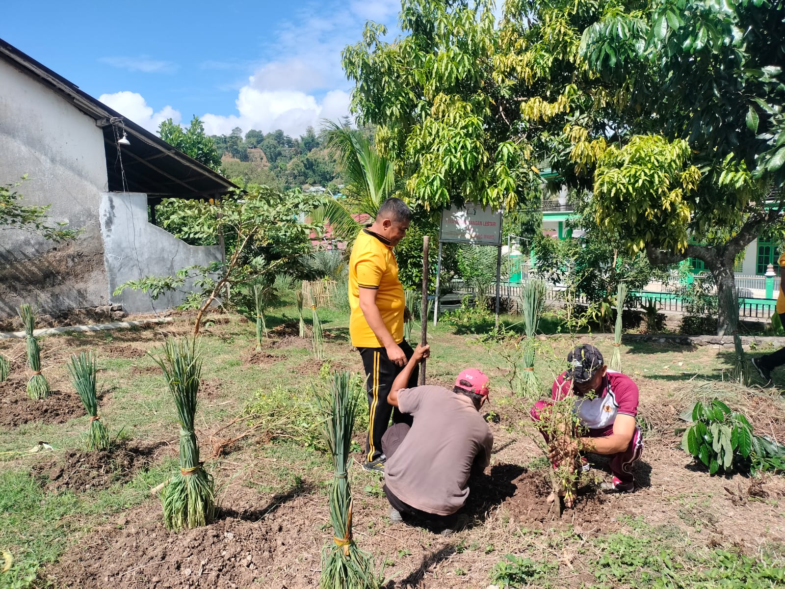 Kegiatan tersebut dilaksanakan pada Sabtu, 25 April 2026, pukul 09.00 WITA, bertempat di halaman Polsek Wawo. Personel Polsek Wawo terlihat kompak memanfaatkan lahan kosong dengan menanam berbagai jenis tanaman hortikultura yang bermanfaat bagi kebutuhan sehari-hari.