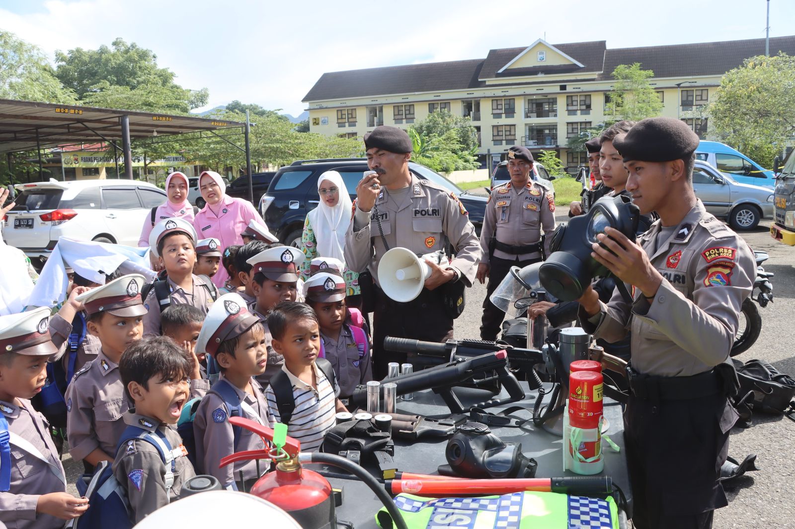 Tak hanya itu, para siswa juga diajak berkeliling melihat langsung berbagai fasilitas di Mako Polres, seperti ruang pelayanan SPKT, ruang tahanan yang disertai edukasi agar tidak melakukan perbuatan melanggar hukum, serta pengenalan kendaraan dinas kepolisian. Suasana semakin meriah saat anak-anak diajak bernyanyi bersama dan berfoto menggunakan atribut polisi cilik.