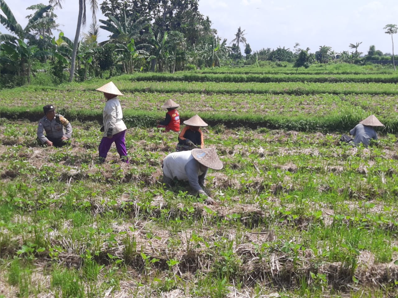 Aiptu Muhammad Bakri menyambangi para petani yang sedang membersihkan rumput liar pada tanaman kedelai mereka. Dalam pertemuan tersebut, ia tidak hanya berdialog tentang situasi keamanan dan ketertiban masyarakat (kamtibmas), tetapi juga secara aktif mendorong partisipasi warga untuk menyukseskan program swasembada pangan nasional.