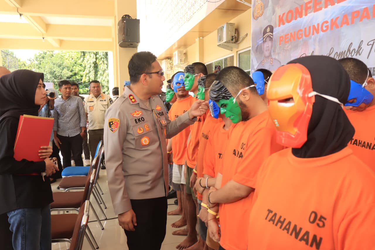 Pesan di Balik Topeng 'Super Hero' Para Tersangka Saat Konferensi di Polres Loteng.