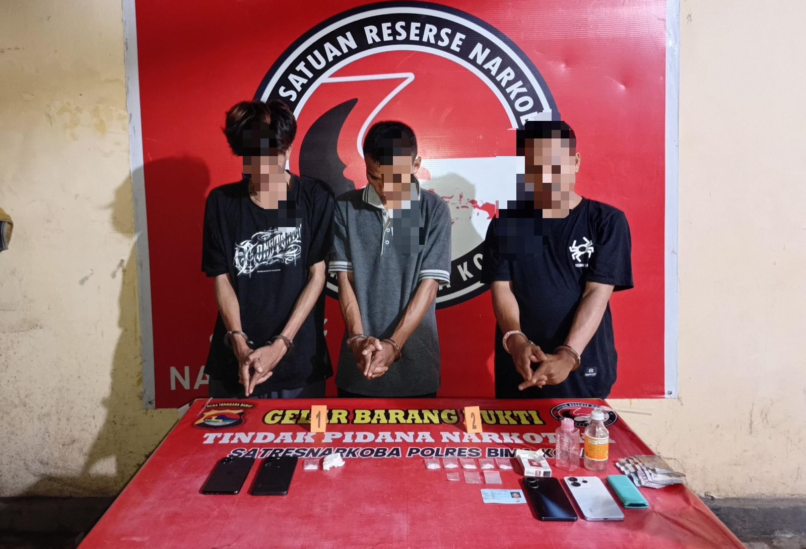 Kapolres Bima Kota, AKBP Didik Putra Kuncoro, S.I.K., M.Si., melalui Kasat Narkoba, AKP Malaungi, S.H., M.H., menjelaskan, tiga terduga masing-masing berinisial FE, MI, dan AD.