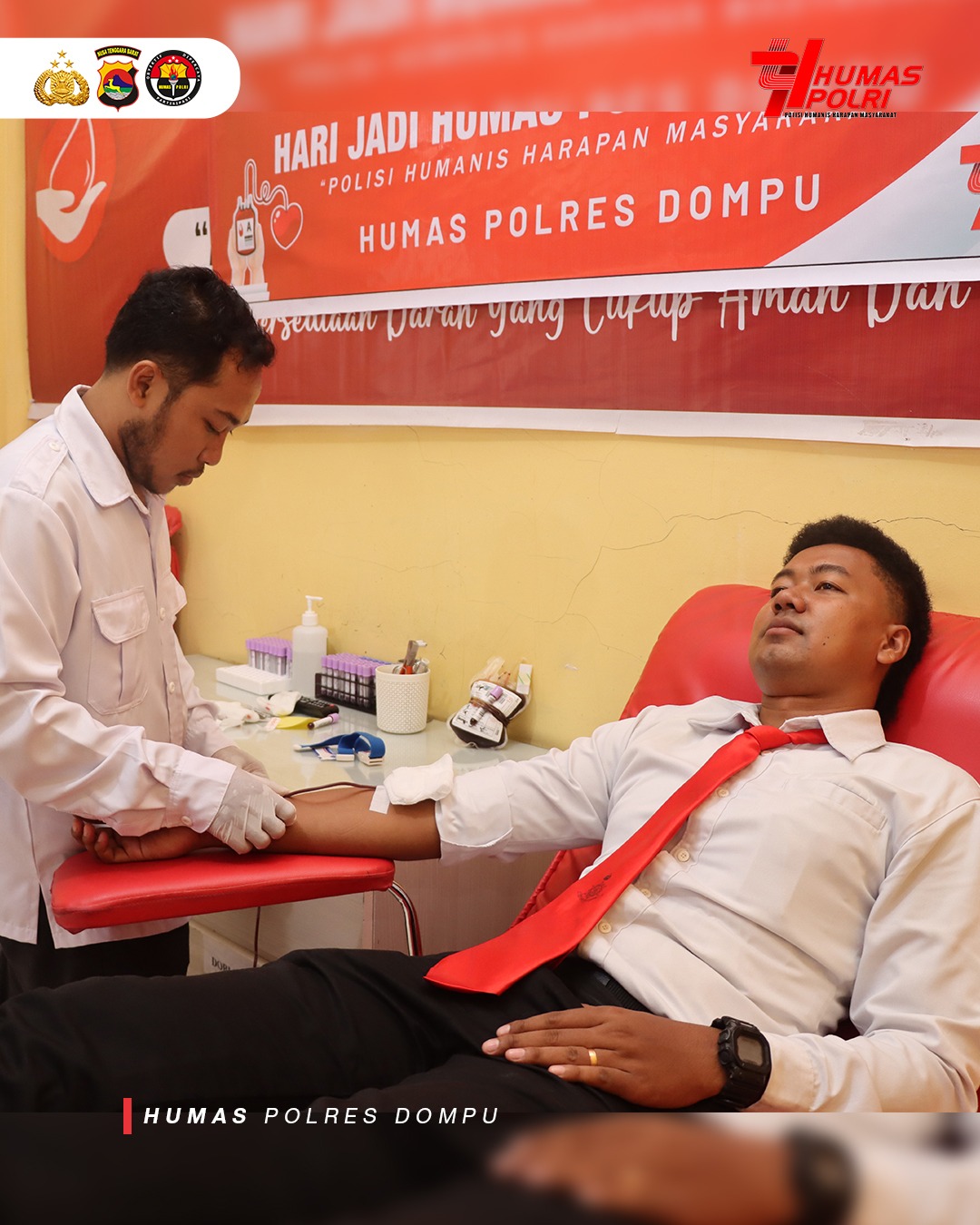 Kegiatan yang berlangsung pada Rabu, 22 Oktober 2025 pukul 08.30 WITA bertempat di Ruang UTD Bank Darah RSUD Dompu ini menjadi wujud nyata kepedulian Polri terhadap sesama melalui aksi kemanusiaan.