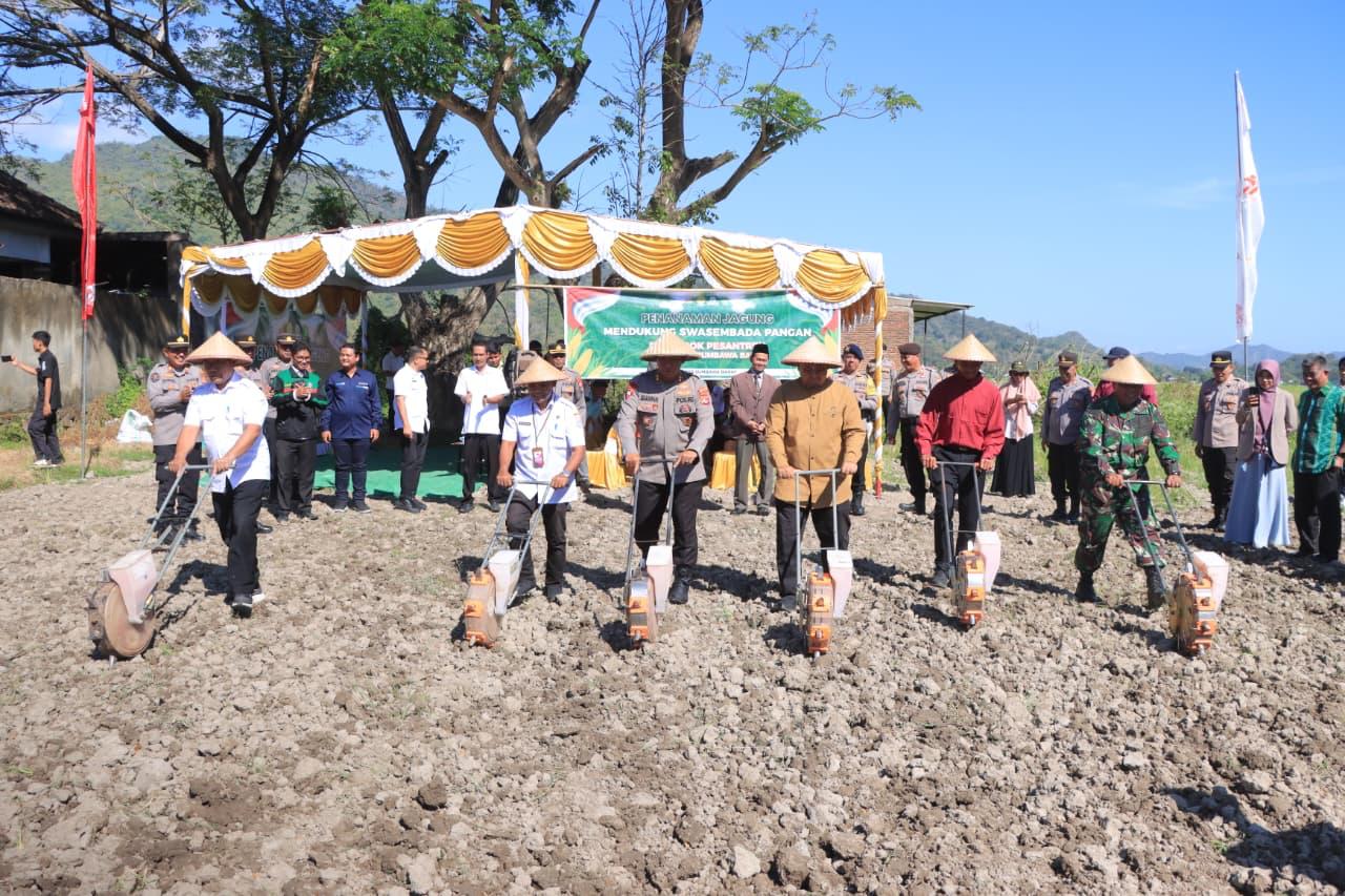 Sumbawa Barat, NTB — Dalam upaya memperkuat ketahanan pangan nasional sekaligus menumbuhkan semangat kemandirian ekonomi di lingkungan pesantren, Kapolres Sumbawa Barat AKBP Zulkarnain, S.I.K. memimpin langsung kegiatan penanaman jagung di lahan milik Pondok Pesantren Al-Ikhlas yang terletak di lingkungan Menala, Kecamatan Taliwang, Kabupaten Sumbawa Barat, pada Rabu (6/8).